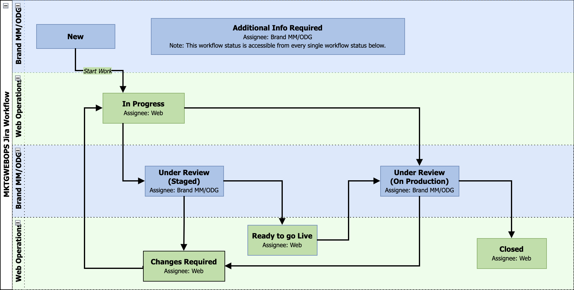 The updated workflow indicates which team is responsible for doing the work in each status. The major changes from our MKTGWEB workflow that we will be using in the MKTGWEBOPS workflow are: