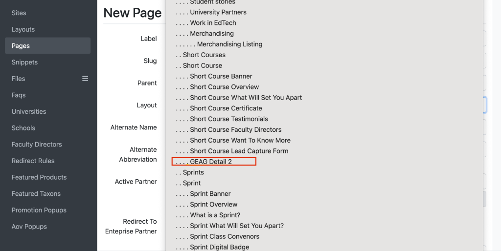 - For the field ‘Layout’, a dropdown will appear, select “GEAG Detail 2” under the “Short Course”