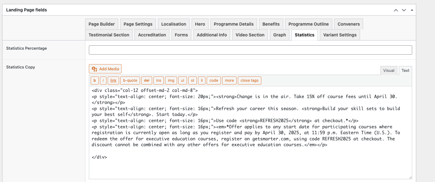 4. Go to the ‘Statistics’ tab within the page editor and change the HTML code with the new copy. Remember that UK courses have different copy language to add.