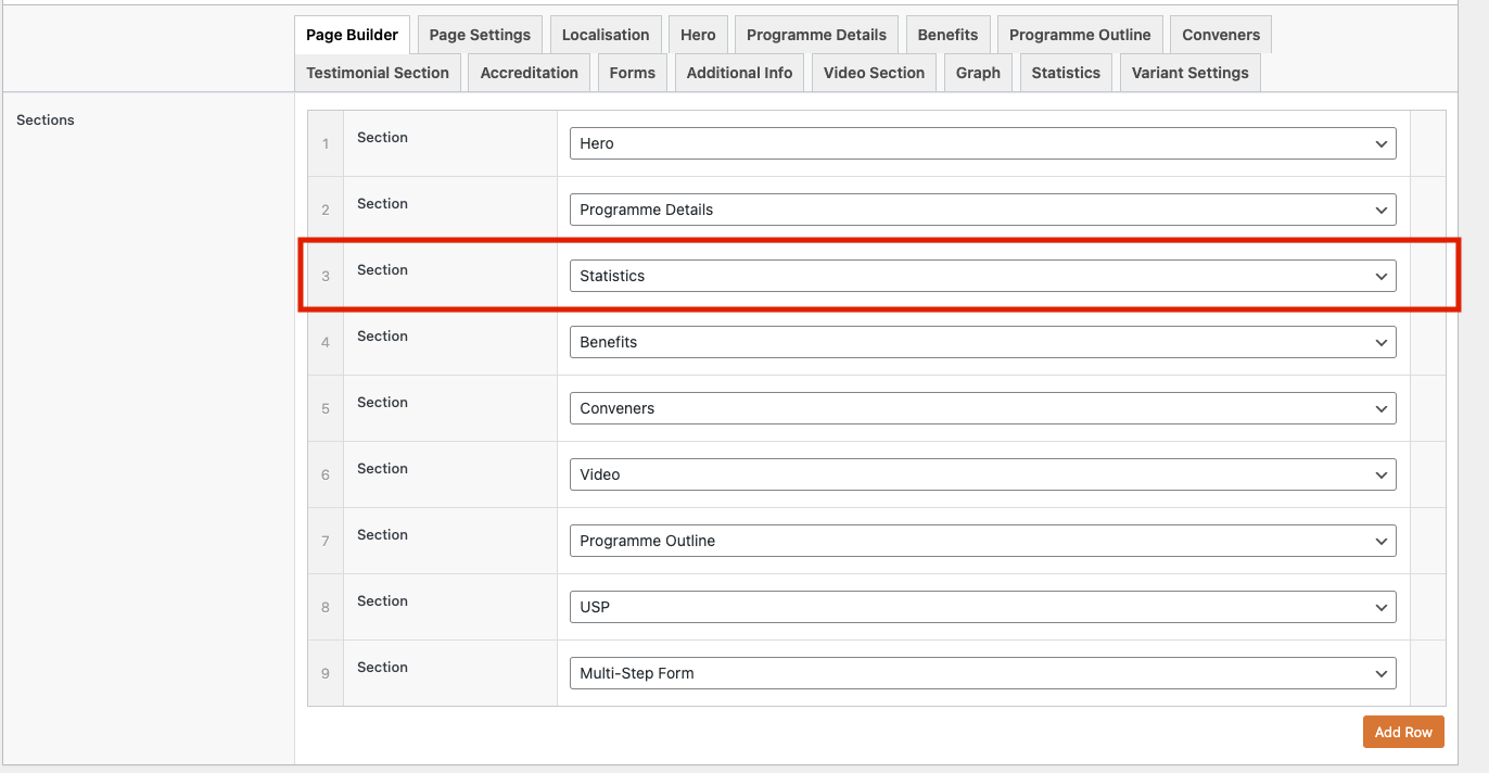 5. Once the promotion copy has been added, go to the Page Builder tab and add an new module for the 3rd section. Select ‘Statistics‘.